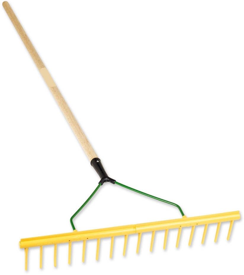16 Tine Polypropylene rake with a grading bar for leveling out soil or sand.