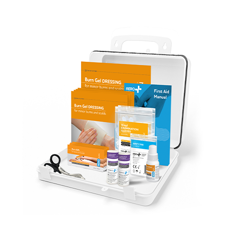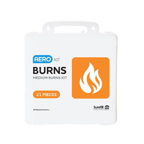 A handy AeroGuide™ first aid manual is included with every AeroKit™ with Surefill™ Medium Burns Kit. The medical items inside the case are neatly arranged and are simple to identify and access so that burns can be treated as quickly as possible.