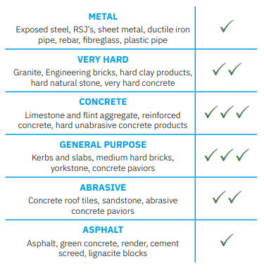Material suitability: Concrete, reinforced concrete, asphalt, metal, abrasive materials