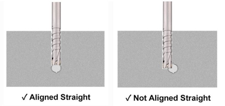A: The annular cutting head must remain concentric with the bore throughout the cut. If the drill is tilted, the TCT teeth on one side of the head make disproportionate contact with the rebar, concentrating wear on two or three teeth rather than distributing it across the full cutting circumference. This is the second most common cause of early tooth failure after incorrect drill mode. The alignment guidance supplied with the product illustrates correct straight entry compared to off-angle entry. If you cannot hold the drill straight by hand in a tight or awkward location, brace the drill body or use a guide.