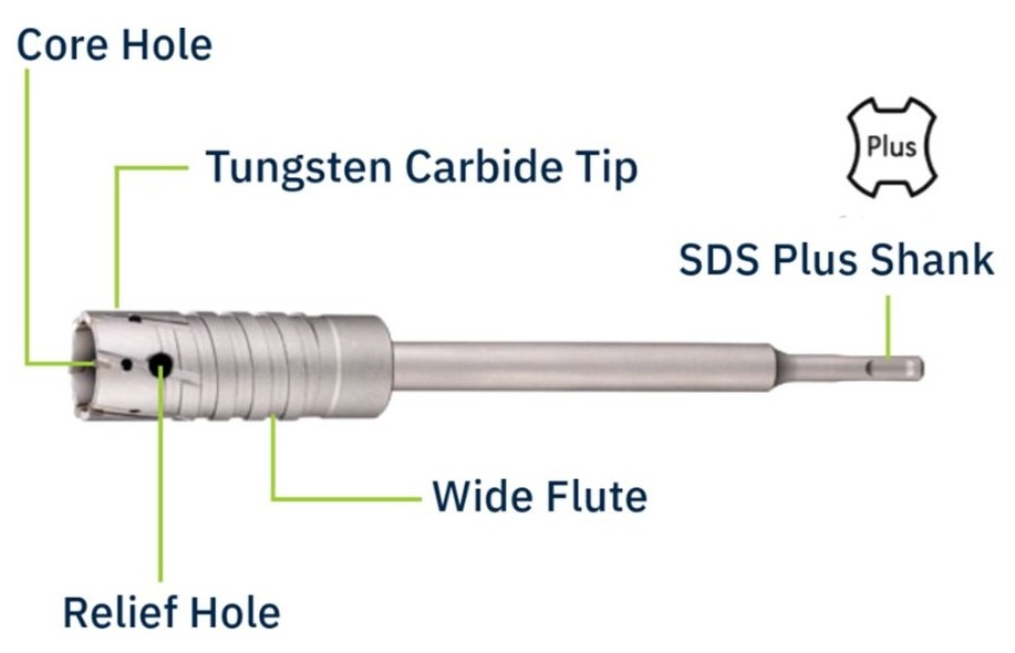 Annular TCT cutting head: The tungsten carbide tipped head is constructed to cut through hardened steel reinforcement, not deflect from it. The annular geometry focuses cutting force directly at the bore diameter, which reduces heat at the tip and distributes wear evenly across the full cutting circumference rather than concentrating it on a single point.