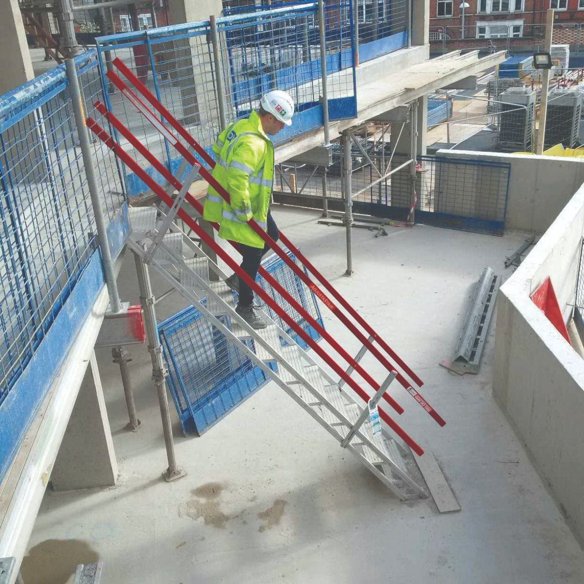 The adjustable and self-levelling aluminium safety stair provides safe, fast, and easy access between floors during construction. Designed for durability and long-lasting performance, this robust aluminium stair is built to withstand demanding site conditions. It features a fold-flat design for effortless storage and transport, making it highly convenient for various job sites. Available in 600mm and 1200mm widths, it can also be joined for better access, offering flexibility to suit different construction needs. Fully compliant with BS EN 12811: Class B standards, this safety stair ensures reliable performance and industry-standard safety.